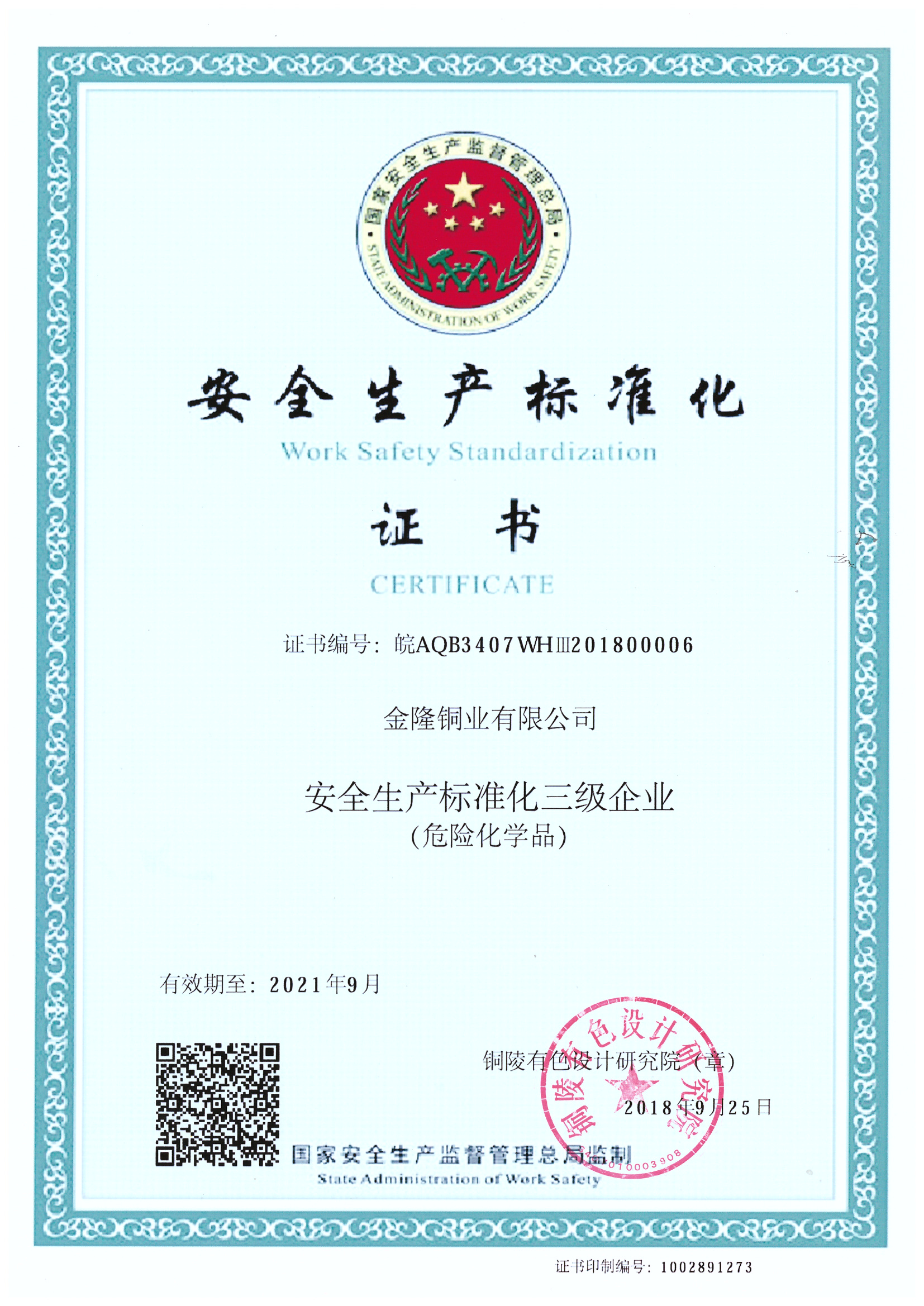 公司“危化品安全生產標準化三級證書(2018年)”已完成換證