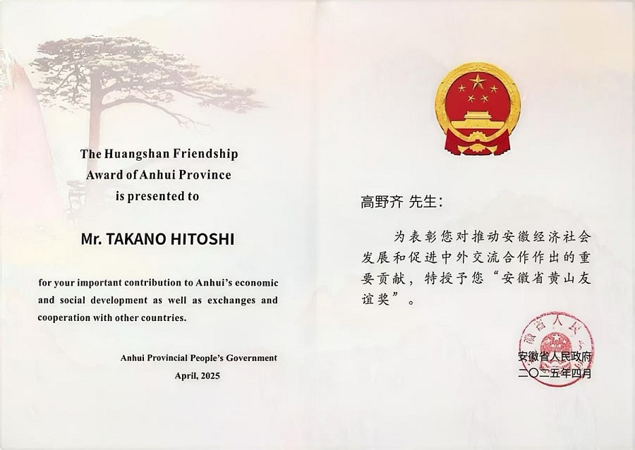 會上,公司日方副總經理高野齊因在推動安徽經濟社會發展和促進中外交流合作方面做出的重要貢獻,榮獲第十六屆安徽省黃山友誼獎。